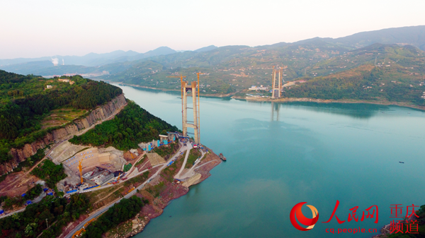 主跨为1020米的新田长江大桥一跨过江,系双塔单跨钢箱梁悬索桥,也是重庆目前在建的最大跨径桥梁。悬索桥素有“桥梁皇后”之称,曲线柔美的主缆,横跨于江面的钢箱梁,与高高矗立于江边的主塔,组成的“几何”构图,既有强劲的刚性气魄,也有优雅的柔性气韵。